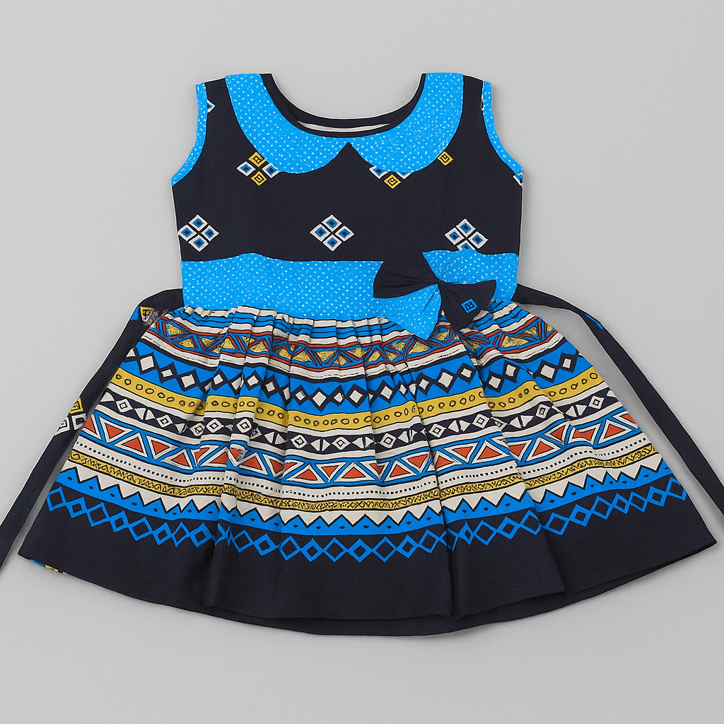 Girls’ Cotton Frock – Sleeveless Multi colour Ethnic Print Dress with Bow
